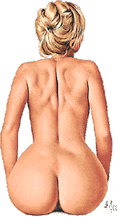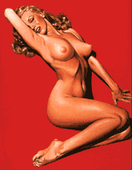 Another useful comparison is between Marilyn's Playboy centerfold and Sorayama's version of it. Here's a side-by-side (and an animation below, if your browser supports QuickTime objects) comparison of Hajime Sorayama's portrait of Marilyn and the original Kelley photo that it was based on. Note how much sharper the edges are in Sorayama's drawing than in the actual photo. Also, amusingly enough, he has augmented Marilyn's measurements. He has made her breasts larger and fuller than reality. He has slimmed her waist, narrowed her hips, thinned her thighs, and lengthened her calves substantially. That he felt he needed to exaggerate one of the most famous pictures of one of the most famous sex symbols in history is rather revealing. That he has made her rib cage stand out so much more distinctly, as if she were undernourished is, given the problems with anorexia and bulimia that plague our culture, tragic. To my eye at least, the actual photo of Marilyn is much more appealing than Sorayama's version. By attempting to exceed reality he has created something a little colder than reality. He's left out the mystery and romance, the heart that is so important to the beauty of women such as Marilyn or Bettie, or to the "girls next door" that they are the idealization of. So far, the artists I've covered have shown a continuing trend from the soft focus and romantic style of the early artists and illustrators to an ever-sharper look, moving through realism and beyond. The next chapter starts with an artist who reverses the trend as a comic book artist spearheads the a nostalgic trend back to the icons of an earlier time.