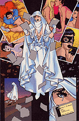 Ghost isn't one of the "bad girls", though. She's a more complicated, richly texture, and in the end, real, woman than they. Wrapped in her voluminous white shroud she is a haunting figure and, like many a real woman, an ex-victim. Several of the "bad girls" are also women who were once victimized, but their reaction seems qualitatively different. Ghost feels a definite remorse and has a conscience. She may distract her enemies with her womanly charms, but she doesn't turn into a seductress or temptress. She is angry over her victimization and that of others and seeks justice more than vengeance.