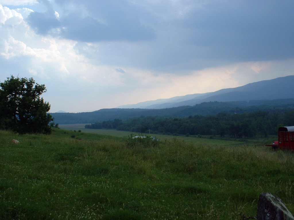 Well, it's now June 2002, and I have seen Anderson’s Bottom, although not the foundations of the old house nor the graveyard. The full bottom land property, has been divided between the Liller and Miller families. Mr. and Mrs. Miller have both died, but their daughter now owns it. Her portion contains the whole of the property surveyed above including the old Seymour house, and is farmed by a man named Bob Scaffer who has lived on the property since the 1930s.The picture to the left (click on it to enlarge) is looking south from the mountain road across the bottom toward the old Anderson house, according to JH Anderson’s map and Thomas Bryan Martin's deed (see below). It was taken in late afternoon as a storm approached off the mountains to the west, beyond Cresaptown.